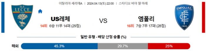 【세리에A】04월13일 레체 vs 엠폴리 이탈리아리그 스포츠분석